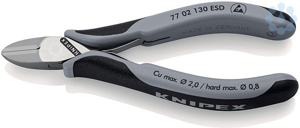 77 02 130 ESD Elektronik-Seitenschneider ESD Robuste, belastungsoptimierte Konstruktion mit durchgestecktem und spielfreiem Gelenk. Schlanke, zum Zangenkopf hochgezogene Hüllen bieten sichere und komfortable Führung auch zwischen Daumen und Zeigefinger. Reibungsarme Doppelfeder für ein sanftes und gleichmäßiges Öffnen. Spiegelpolitur statt Verchromung: keine Störungen im Schaltkreis durch abblätternde Chromteile. Für feine Schneid- und Montagearbeiten, z. B. in Elektronik und Feinmechanik. Schneiden zusätzlich lasergehärtet, Schneidenhärte ca. 62 HRC. runder Kopf, mit kleiner Facette. Schneidenhärte ca. 62 HRC. - Schneidwerte mittelharter Draht (Durchmesser): Ø 1,5mm - Schneidwerte harter Draht (Durchmesser): Ø 0,8mm - Schneidwerte weicher Draht (Durchmesser): Ø 0,3???2mm - Backenlänge (B): 16,2mm - Backendicke (am Gelenk) (D): 8,5mm - Kopfbreite (A): 13mm - Schneidenlänge mm (C): 16,2mm - ESD: ja .