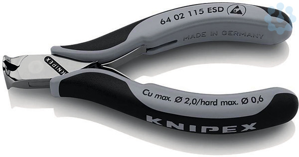 64 02 115 ESD Elektronik-Vornschneider ESD Präzisionszangen für feinste Schneidarbeiten, z. B. in Elektronik und Feinmechanik. Griffe elektrisch ableitend ? dissipativ. Durchgestecktes Präzisionsgelenk. Reibungsarme Doppelfeder für ein sanftes und gleichmäßiges Öffnen. Die Spiegelpolitur bietet in Verbindung mit einem feinen Ölfilm einen guten Rostschutz ? keine Störungen im Schaltkreis durch abblätternde Chromteile. Schneiden zusätzlich lasergehärtet, Schneidenhärte mindestens 56 HRC. Griffe mit zweifarbigen Mehrkomponenten-Hüllen schwarz/grau. Vornschneider, mit kleiner Facette. - Schneidwerte weicher Draht (Durchmesser): Ø 2,0mm - Schneidwerte mittelharter Draht (Durchmesser): Ø 1,0mm - Schneidwerte harter Draht (Durchmesser): Ø 0,6mm - Kopfbreite (A): 11mm - Backenlänge (B): 6mm - Backendicke (am Gelenk) (D): 7,5mm - Schneidenlänge mm (C): 16mm - ESD: Ja