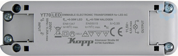Elektronischer Transformator 70W/VA, 1 Eingang/ 1 Ausgang, Leerlaufsicher, Softstarter (Schonung der Leuchtmittel), Geräuscharm, Übertemperaturschutz, Kurzschlussfest, dimmbar mit Phasenabschnittdimmer, Maße: 118x36,5x35mm, Eingangsspannung 230VAC ? 50Hz, Ausgangsspannung 11,5VAC ? 30kHz, für LEDs 30W geeignet