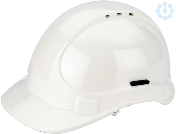 Leichter und moderner Kopfschutz nach DIN EN 50365 aus HDPE (Polyethylen), Schutzklasse 0, hygienisches Stirn-Schweißband, seitliche Schlitze zur Befestigung von Gehör- oder Gesichtsschutz, Ratschenkopfband, Innengurtband-Ausstattung, für Kopfgrößen 54 ?? 61 cm, Gewicht: 330 g