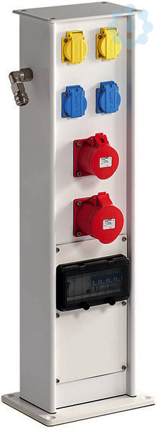 ELSPRO-Aluminium-Energiesäule, Baureihe AL-POWER 800, Gesamthöhe = 800 mm, Eingang: 1 Leitungsdurchführung, zum Einführen einer Zuleitung, max. 5G6 mm², Ausgang: 1 CEE-Einbausteckdose 5x32 A/400 V, ohne Absicherung, 1 CEE-Einbausteckdose 5x16 A/400 V, abgesichert über 1 MCB 16 A/3 pol. in C-Charakteristik, 2 Schutzkontaktsteckdosen, zusammen abgesichert über 1 MCB 16 A/1 pol. in B-Charakteristik, * alle Steckdosen werden gemeinsam über eine RCD 40 A/30 mA/4 pol. geführt, weitere Einbauten: 2 Netzwerksteckdosen, mit je 2 Anschlüssen RJ45, 1 Einhand-Druckluft-Schnellkupplung, Ausführung: - Industrieausführung, - spritzwasssergeschützt, - alle Aluminiumteile eloxiert und kunststoffpulverbeschichtet, Farbe: Weiss, - mit Dichtungen zwischen den Bauteilen, - mit robuster Boden- und Deckelplatte, - die Schutzeinrichtungen sind von außen zugänglich und liegen geschützt hinter einem schlagfesten Sichtklappenfenster, selbstschließend und mit 2 Rändelschrauben versehen