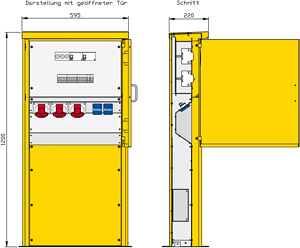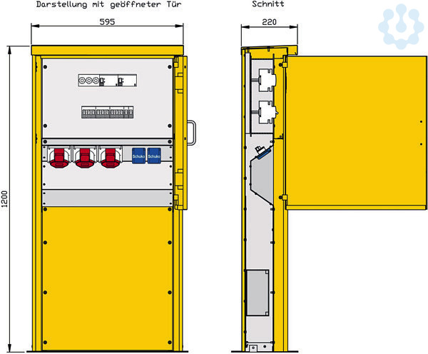 Anschluss der Versorgungsleitungen Tür mit Griff und Kugelschnapper Kabelausführung bei geschlossener Tür möglich Schutzart: IP44 Größe ca.: 1200 x 595 x 220mm / H-B-T
