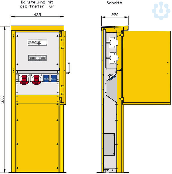 Anschluss der Versorgungsleitungen Tür mit Griff und Kugelschnapper Kabelausführung bei geschlossener Tür möglich Schutzart: IP44 Größe ca.: 1200 x 435 x 220mm / H-B-T