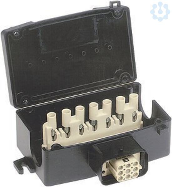 Energieverteiler, mit 1x Han Q 8/0, Buchseneinsatz, im Han-Compact Tüllengehäuse, Schneidklemmanschluss, für flexible Leiter nach IEC 60228 Klasse 5, Kontakte: 8, Leiterquerschnitt: 2,5...4 mm², Werkstoff Gehäuse: Polycarbonat (PC), RAL 9005 (tiefschwarz), Schutzart: IP65