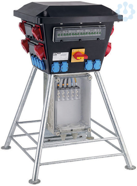 ELSPRO-Vollgummi-Energieverteiler, Baureihe HAMBURG, Eingang: 2 Gummi-Leitungseinführungen, mit 1 Hochstromklemmenblock, zum Schleifen der Zuleitung, max. 2x5x70 mm², (max. Vorabsicherung 125 A), mit außenliegenden Zugentlastungen, Ausgang: 2 CEE-Einbausteckdosen 5x63 A/400 V, abgesichert über 2 MCB 63 A/3 pol. in C-Charakteristik, * sowie einzeln über je eine RCD 63 A/30 mA/4 pol. geführt, 4 CEE-Einbausteckdosen 5x32 A/400 V, abgesichert über 4 MCB 32 A/3 pol. in C-Charakteristik, 4 CEE-Einbausteckdosen 5x16 A/400 V, abgesichert über 4 MCB 16 A/3 pol. in C-Charakteristik, 12 Schutzkontaktsteckdosen, abgesichert über 12 MCB 16 A/1 pol. in B-Charakteristik, * jeweils 2xCEE 32 A, 2xCEE 16 A und 6 Schutzkontaktsteckdosen werden gemeinsam über je eine RCD 63 A/30 mA/4 pol. geführt, die über MCB 63 A/3 pol. vorabgesichert ist, * weitere Einbauten: 1 Hauptschalter 125 A/3 pol., zur Gesamtabschaltung, Ausführung: - K2 Ausführung, - schutzisoliert und spritzwassergeschützt, - die Schutzeinrichtungen sind von außen zu