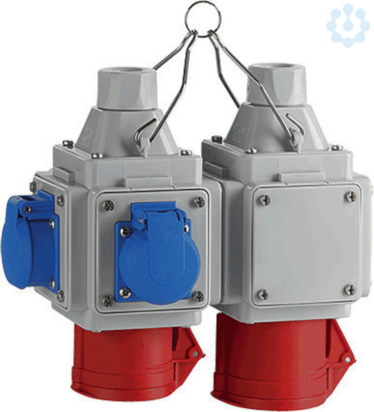 Der abhängbare Energiewürfel für 2 Zuleitungen ist anschlussfertig verdrahtet. Jeder Energiewürfel, einschließlich der Einbaugeräte, ist stückgeprüft nach EN 61439-3. Der gesamte Energiewürfel ist spritzwassergeschützt nach IP 44. Das Gehäuse wird aus dem Kunststoff Polyamid gefertigt. Dieser hochwertige Kunststoff zeichnet sich besonders durch seine hervorragende Festigkeit und Zähigkeit aus. Die Gehäusefarbe ist lichtgrau (elektrograu). Ohne Einbauten hat der Würfel die Abmessung von (HxBxT) 160 x 104 x 104 mm. Der Energiewürfel ist mit 3 x SCHUKO-Steckdosen und 1 x CEE-Steckdose 5/32A 400V 6h rot, 1 x CEE-Steckdose 5/16A 400V 6h rot bestückt. Das Gehäuse hat einen Aufhängebügel und eine Leitungseinführung (Verschraubung) von oben. Die Verschraubung ist für eine Zuleitung von 3 x 1,5 mm² bis zu 5 x 6 mm² geeignet. Der Außendurchmesser der Zuleitung darf maximal 19 mm betragen. Zum Anschluss der Zuleitung steht ein Klemmstein zur Verfügung. Der Klemmstein ist für eine Zuleitungen von 5 x 6 mm² (starr) geeign