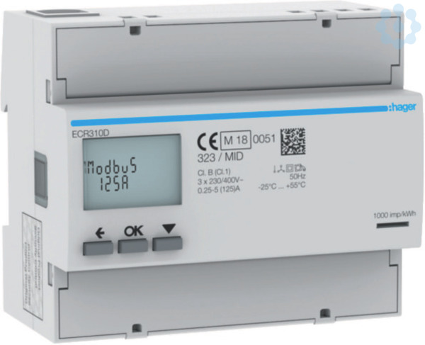Energiezähler 3phasig, direkt 125A, 6M, MODBUS, MID. Energiezähler zur 4-Quadrantenmessung mit folgenden Genauigkeitsklassen: Wirkenergie Class B nach DIN EN 50470-3, Wirkleistung Class 1 nach IEC 62053-21, Wirkleistung Class 1 nach IEC 61557-12 und Blindleistung Class 2 nach IEC 62053-23. Der Zweirichtungszähler wird ab Werk MID zertifiziert (ein Plombierset im Lieferumfang enthalten) und enthält einen rücksetzbaren Teilzähler. Zur Messung von Energiebezug- und Energielieferung in allen Netzsystemen geeignet. Bis zu 8 Tarifzählungen möglich (2 Tarifzählungen über 230 V AC und Modbus, zusätzlich 6 Tarifzählungen über Modbus ansteuerbar). Digitales Display mit Beleuchtung zur Anzeige von bezogener und gelieferter Wirk- (kWh) und Blindenergie (kvarh) für alle Tarife. Zusätzlich werden je Außenleiter die Echtzeitmesswerte für Wirkleistung (kW), Blindleistung (kvar), Scheinleistung (kVA), Spannung (V), Strom (A), Leistungsfaktor, Frequenz (Hz) und Tarif in einer Auflösung bis zu 9 Stellen inklusive zwei Nachkomma