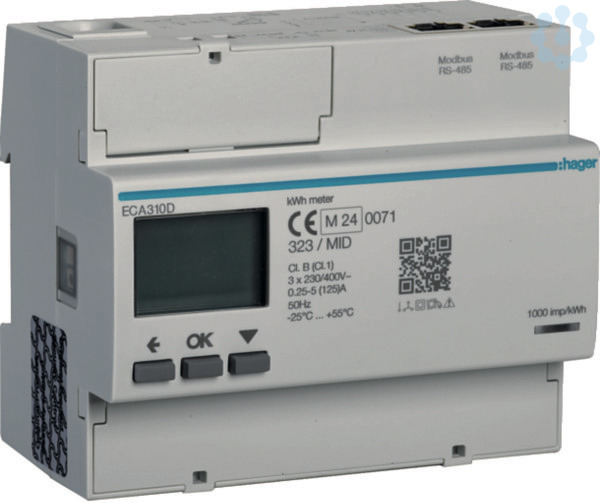 Energiezähler 3phasig, direkt 125A, 6M, AGARDIO, MID. Energiezähler zur 4-Quadrantenmessung mit folgenden Genauigkeitsklassen: Wirkenergie Class B nach DIN EN 50470-3, Wirkleistung Class 1 nach IEC 62053-21, Wirkleistung Class 1 nach IEC 61557-12 und Blindleistung Class 2 nach IEC 62053-23. Der Zweirichtungszähler wird ab Werk MID zertifiziert (ein Plombierset im Lieferumfang enthalten) und enthält einen rücksetzbaren Teilzähler. Zur Messung von Energiebezug- und Energielieferung in allen Netzsystemen geeignet. Bis zu 8 Tarifzählungen möglich (2 Tarifzählungen über 230 V AC und Modbus, zusätzlich 6 Tarifzählungen über Modbus ansteuerbar). Digitales Display mit Beleuchtung zur Anzeige von bezogener und gelieferter Wirk- (kWh) und Blindenergie (kvarh) für alle Tarife. Zusätzlich werden je Außenleiter die Echtzeitmesswerte für Wirkleistung (kW), Blindleistung (kvar), Scheinleistung (kVA), Spannung (V), Strom (A), Leistungsfaktor, Frequenz (Hz) und Tarif in einer Auflösung bis zu 9 Stellen inklusive zwei Nachkomm