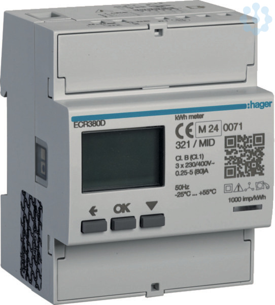 Energiezähler 3phasig, direkt 80A, 4M, MODBUS, MID. Energiezähler zur 4-Quadrantenmessung mit folgenden Genauigkeitsklassen: Wirkenergie Class B nach DIN EN 50470-3, Wirkleistung Class 1 nach IEC 62053-21, Wirkleistung Class 1 nach IEC 61557-12 und Blindleistung Class 2 nach IEC 62053-23. Der Zweirichtungszähler wird ab Werk MID zertifiziert (ein Plombierset im Lieferumfang enthalten) und enthält einen rücksetzbaren Teilzähler. Zur Messung von Energiebezug- und Energielieferung in allen Netzsystemen geeignet. Bis zu 8 Tarifzählungen möglich (2 Tarifzählungen über 230 V AC und Modbus, zusätzlich 6 Tarifzählungen über Modbus ansteuerbar). Digitales Display mit Beleuchtung zur Anzeige von bezogener und gelieferter Wirk- (kWh) und Blindenergie (kvarh) für alle Tarife. Zusätzlich werden je Außenleiter die Echtzeitmesswerte für Wirkleistung (kW), Blindleistung (kvar), Scheinleistung (kVA), Spannung (V), Strom (A), Leistungsfaktor, Frequenz (Hz) und Tarif in einer Auflösung bis zu 9 Stellen inklusive zwei Nachkommas