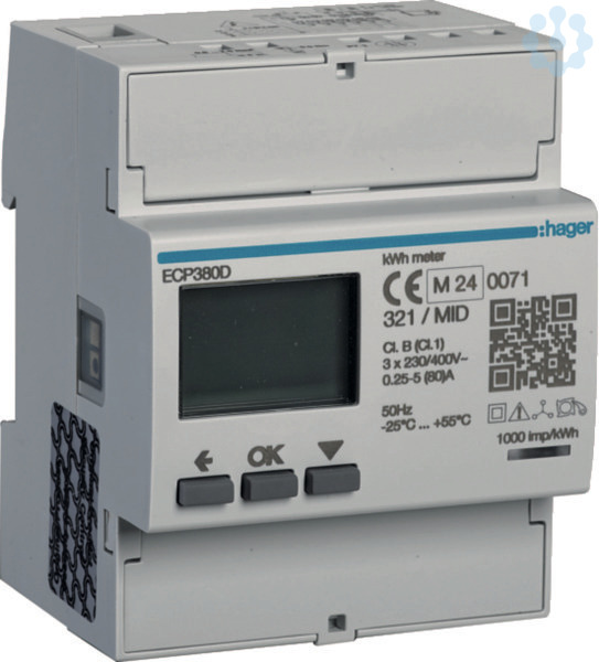 Energiezähler 3phasig, direkt 80A, 4M, S0, MID. Energiezähler zur 4-Quadrantenmessung mit folgenden Genauigkeitsklassen: Wirkenergie Class B nach DIN EN 50470-3, Wirkleistung Class 1 nach IEC 62053-21, Wirkleistung Class 1 nach IEC 61557-12 und Blindleistung Class 2 nach IEC 62053-23. Der Zweirichtungszähler wird ab Werk MID zertifiziert (ein Plombierset im Lieferumfang enthalten) und enthält einen rücksetzbaren Teilzähler. Zur Messung von Energiebezug- und Energielieferung in allen Netzsystemen geeignet. 2 Tarifzählungen über 230 V AC ansteuerbar und Ausgabe über 2 Impulsausgänge konfigurierbar. Digitales Display mit Beleuchtung zur Anzeige von bezogener und gelieferter Wirk- (kWh) und Blindenergie (kvarh) für alle Tarife. Zusätzlich werden je Außenleiter die Echtzeitmesswerte für Wirkleistung (kW), Blindleistung (kvar), Scheinleistung (kVA), Spannung (V), Strom (A), Leistungsfaktor, Frequenz (Hz) und Tarif in einer Auflösung bis zu 9 Stellen inklusive zwei Nachkommastellen angezeigt. Über Impulsausgang werd