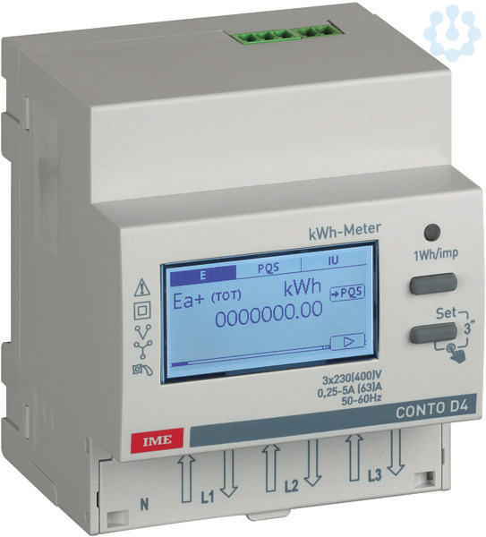 IME Energiezähler Conto D4-Pd, 63 A, 3-phasig, Direktanschluss, 400 VAC, 4-modulig, mit Impulsausgang, zur Messung der verbrauchten Wirkenergie eines 3-phasigen Stromkreises, mit Stundenzähler (Zählstart bei vorhandener Dreiphasenwirkleistung).