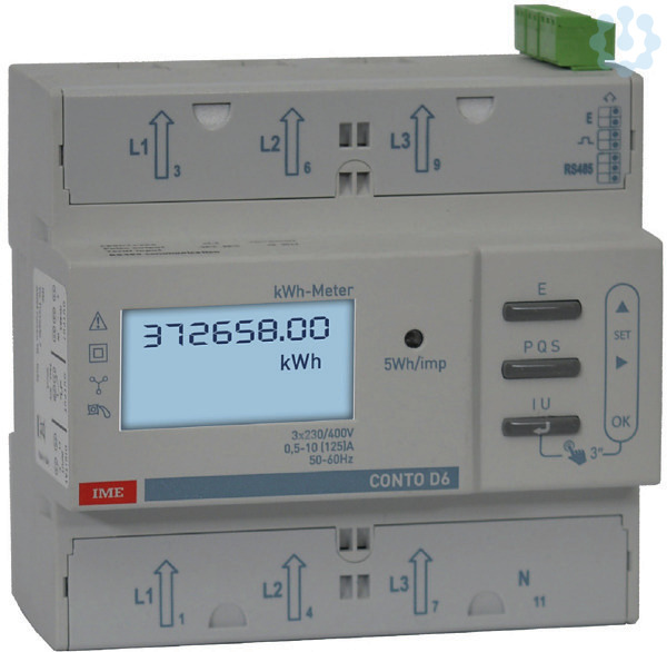 IME Energiezähler Conto D6-Pd, 125 A, 3-phasig, Direktanschluss, 400 VAC, 6-modulig, mit Impulsausgang, zur Messung der verbrauchten Wirkenergie eines 3-phasigen Stromkreises, mit Stundenzähler (Zählstart 0,4 ? 50% Nennleistung).