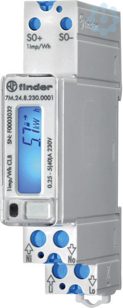 Elektronischer Energiezähler mit S0-Schnittstelle, bidirektional, für 1-Phasen Wechselstrom mit 7-stelliger LCD-Anzeige, hintergrundbeleuchtet. Anzeige von Gesamtverbrauch kWh, LED-Verbrauchsanzeige: 1000 Impulse pro kWh, maximaler Strom 40 A, Kurzzeitüberstrom (Impulsstrom): 1200 A für 10 ms, Anlaufstrom: 0,02 A, Genauigkeitsklasse 1, Reiheneinbaugerät für Tragschiene 35 mm (EN 60715), Baubreite 17,5 mm, Nennspannung 230 V AC. S0-Schnittstelle: 1000 Impulse pro kWh. Anschlussquerschnitte Hauptstromkreis: eindrähtig 1,5 bis 10 mm², mehrdrähtig 1,5 bis 10 mm², Umgebungstemperatur: -25 bis + 55°C, Schutzart Gehäuse/Anschlüsse: IP50/IP20. Plombierbare Klemmenabdeckungen
