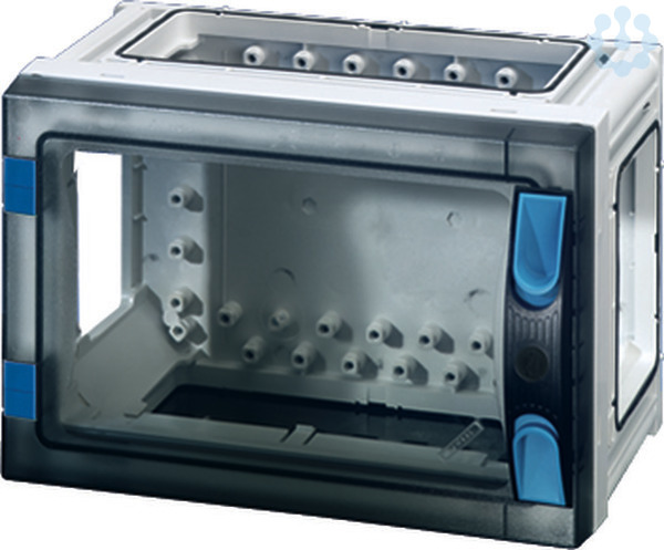 Gehäuse mit Tür für den Bau von Installationsverteilern bis 250 A für die Bedienung durch Laien nach IEC 61439-3. Offene Gehäusewände für die Kombination oder als Einzelgehäuse mit Verschlussplatten. Aus hochwertigem Polycarbonat, schutzisoliert. Schnelle Gehäuseverbindung durch Steckverbinder und integrierte Dichtungen. Große Wanddurchführungen für die elektrische Verbindung der Gehäuse untereinander. Kabeleinführung über Flansche. Wandbefestigung direkt am Gehäuse, über Außenlaschen oder mit Montageschienen. Leergehäuse mit transparenter Tür und plombierbarem Türverschluss mit Handbetätigung. Für den Einbau von Geräten auf Montageplatte oder DIN-Tragschiene, Einbaumaße B 216 x H 126 x T 140 mm. Max. Einbautiefe bei eingebauter Montageplatte 136 mm, bei eingebauter Tragschiene 125 mm.