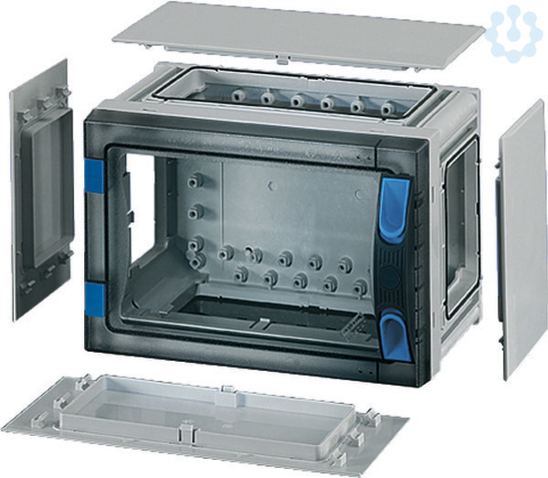 Gehäuse mit Tür für den Bau von Installationsverteilern bis 250 A für die Bedienung durch Laien nach IEC 61439-3. Offene Gehäusewände für die Kombination oder als Einzelgehäuse mit Verschlussplatten. Aus hochwertigem Polycarbonat, schutzisoliert. Schnelle Gehäuseverbindung durch Steckverbinder und integrierte Dichtungen. Große Wanddurchführungen für die elektrische Verbindung der Gehäuse untereinander. Kabeleinführung über Flansche. Wandbefestigung direkt am Gehäuse, über Außenlaschen oder mit Montageschienen. Leergehäuse mit transparenter Tür und plombierbarem Türverschluss mit Handbetätigung mit Verschlussplatten-Set. Für den Einbau von Geräten auf Montageplatte oder DIN-Tragschiene, Einbaumaße B 216 x H 126 x T 140 mm. Max. Einbautiefe bei eingebauter Montageplatte 136 mm, bei eingebauter Tragschiene 125 mm.