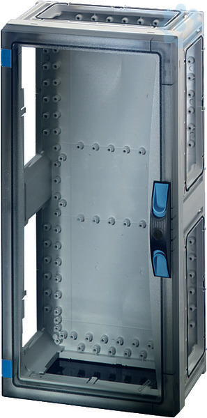 Gehäuse mit Tür für den Bau von Installationsverteilern bis 250 A für die Bedienung durch Laien nach IEC 61439-3. Offene Gehäusewände für die Kombination oder als Einzelgehäuse mit Verschlussplatten. Aus hochwertigem Polycarbonat, schutzisoliert. Schnelle Gehäuseverbindung durch Steckverbinder und integrierte Dichtungen. Große Wanddurchführungen für die elektrische Verbindung der Gehäuse untereinander. Kabeleinführung über Flansche. Wandbefestigung direkt am Gehäuse, über Außenlaschen oder mit Montageschienen. Leergehäuse mit transparenter Tür und plombierbarem Türverschluss mit Handbetätigung. Für den Einbau von Geräten auf Montageplatte oder DIN-Tragschiene, Einbaumaße B 216 x H 486 x T 140 mm. Max. Einbautiefe bei eingebauter Montageplatte 136 mm, bei eingebauter Tragschiene 125 mm.