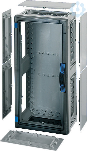 Gehäuse mit Tür für den Bau von Installationsverteilern bis 250 A für die Bedienung durch Laien nach IEC 61439-3. Offene Gehäusewände für die Kombination oder als Einzelgehäuse mit Verschlussplatten. Aus hochwertigem Polycarbonat, schutzisoliert. Schnelle Gehäuseverbindung durch Steckverbinder und integrierte Dichtungen. Große Wanddurchführungen für die elektrische Verbindung der Gehäuse untereinander. Kabeleinführung über Flansche. Wandbefestigung direkt am Gehäuse, über Außenlaschen oder mit Montageschienen. Leergehäuse mit transparenter Tür und plombierbarem Türverschluss mit Handbetätigung und Verschlussplatten-Set. Für den Einbau von Geräten auf Montageplatte oder DIN-Tragschiene, Einbaumaße B 216 x H 486 x T 140 mm. Max. Einbautiefe bei eingebauter Montageplatte 136 mm, bei eingebauter Tragschiene 125 mm.