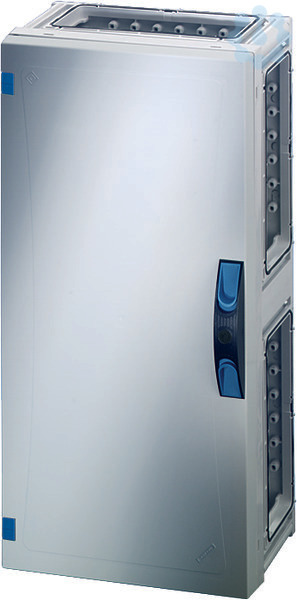 Gehäuse mit Tür für den Bau von Installationsverteilern bis 250 A für die Bedienung durch Laien nach IEC 61439-3. Offene Gehäusewände für die Kombination oder als Einzelgehäuse mit Verschlussplatten. Aus hochwertigem Polycarbonat, schutzisoliert. Schnelle Gehäuseverbindung durch Steckverbinder und integrierte Dichtungen. Große Wanddurchführungen für die elektrische Verbindung der Gehäuse untereinander. Kabeleinführung über Flansche. Wandbefestigung direkt am Gehäuse, über Außenlaschen oder mit Montageschienen. Leergehäuse mit nicht durchsichtiger Tür und plombierbarem Türverschluss mit Handbetätigung. Für den Einbau von Geräten auf Montageplatte oder DIN-Tragschiene, Einbaumaße B 216 x H 486 x T 140 mm. Max. Einbautiefe bei eingebauter Montageplatte 136 mm, bei eingebauter Tragschiene 125 mm.