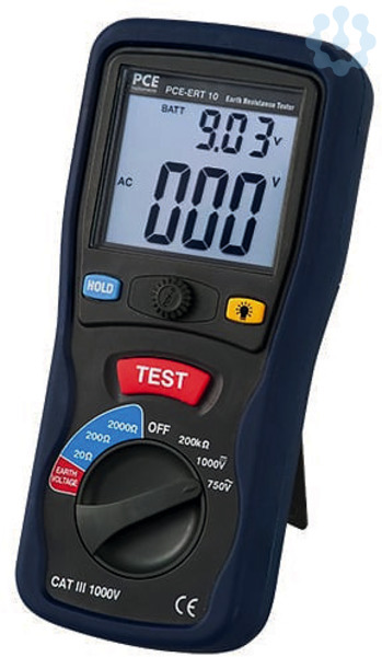 Während der Messung vom Erdwiderstand wird im großen LCD-Display, mit Hintergrundbeleuchtung, neben dem Messwert auch die Batteriespannung angezeigt. Diese Spezialfunktion vom Erdungsmessgerät hilft dem Messtechniker dabei, den Ladezustand der Batterien vom Erdungsmessgerät direkt zu erkennen. Im Lieferumfang sind neben dem Erdungsmessgerät und den notwendigen Messleitungen auch die Erdspieße enthalten. Das Set wird durch eine Tragetasche abgerundet, in welcher sämtliches Zubehör