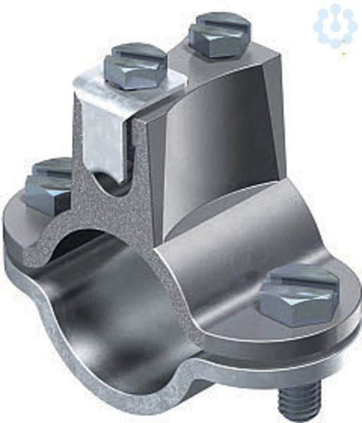 Erdungsschelle - Anschlussmöglichkeiten: Leitungen 16-70 mm² bzw. Rundleiter bis Rd 10 mit unverlierbarer Druckleiste aus rostfreiem Stahl - Mit 2 Sechskantschrauben M6 x 16 und 2 Sechskantschrauben M8 x 20 aus Stahl, feuerverzinkt - Schellenoberteil mit angegossener Klemmstelle aus Zinkdruckguß, Schellenunterteil aus Stahl, feuerverzinkt Rohrdurchmesser: 1 1/2 Gewicht: 34,72 kg/100 St. Typ: 952 Z 1 1/2 Art.-Nr.: 5052157