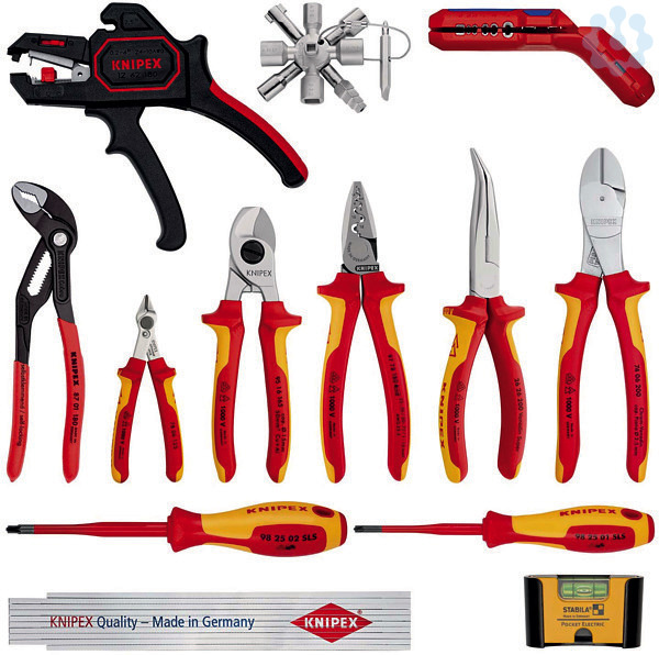 00 20 90 V02 Erweiterungsset Elektro 2 Lieferumfang: 1 x 00 11 01 KNIPEX TwinKey® Schaltschrankschlüssel für gängige Schränke und Absperrsysteme, 1 x 95 16 165 KNIPEX Kabelschere (Ø 15 mm / 50 mm²), 1 x 97 78 180 KNIPEX Crimpzange für Aderendhülsen (0,25 ? 16 mm²), 1 x 87 01 180 KNIPEX Cobra® Hightech-Wasserpumpenzange, 1 x 12 62 180 KNIPEX Automatische Abisolierzange (0,2 ? 6,0 mm²), 1 x 16 95 01 SB KNIPEX ErgoStrip® Universal-Abmantelungswerkzeug (Ø 8,0 ? 13,0 mm), 1 x 74 06 200 KNIPEX Kraft-Seitenschneider, 1 x 98 25 01 SLS KNIPEX Schraubendreher (Slim) PlusMinus Pozidriv® (PZ/S 1), 1 x 98 25 02 SLS KNIPEX Schraubendreher (Slim) PlusMinus Pozidriv® (PZ/S 2), 1 x 26 26 200 KNIPEX Flachrundzange mit Schneide (Storchschnabelzange), 1 x 18115 Stabila Mini-Wasserwaage Pocket Electric (68 mm), 1 x 78 06 125 KNIPEX Electronic Super Knips® VDE, 1 x L240 00055 Knipex Zollstock Stabila Serie 400 (200 mm),