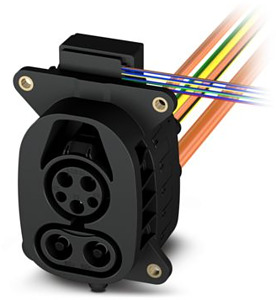 CHARX connect, Fahrzeug-Ladedose, Verriegelungsaktuator oben, Zum Laden mit Wechselstrom (AC) und mit Gleichstrom (DC), Zur Installation in Elektrofahrzeugen (EV), Typ 1, Combined Charging System, IEC 62196-2, IEC 62196-3, 200 A / 1000 V (DC), 48 A / 250 V (AC), Länge: 2 m, Verriegelungsaktuator: 12 V, 4-polig, M6, Generation 4, Für die DC- und AC-Kontakte ist eine Schutzkappe im Lieferumfang enthalten.