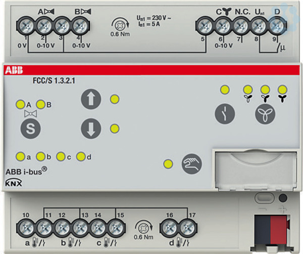 Ein Relaisausgang schaltet eine zusätzliche Last von bis zu 16 A, wie z. B. eine elektrische Zusatzheizung. Über 4 Eingänge kann der Raumstatus erfasst und überwacht werden (nutzbar für Fensterkontakt, Taupunktsensor, Füllstandssensor oder Temperatursensor). Außerdem ist es möglich, ein analoges Raumbediengerät (SAR/A oder SAF/A) mit den Eingängen des Gerätes zu verbinden. Zur Regelung der Raumtemperatur verfügt das Gerät über einen integrierten Raumtemperaturregler, welcher direkt zur Steuerung der Ausgänge des Gerätes verwendet werden kann. Der FCC/S 1.3.2.1 verfügt über eine einfach zu nutzende Vorortbedienung. Für erweiterte Diagnosefunktionen sowie eine verbesserte Inbetriebnahme kann das ABB i-bus Tool genutzt werden.