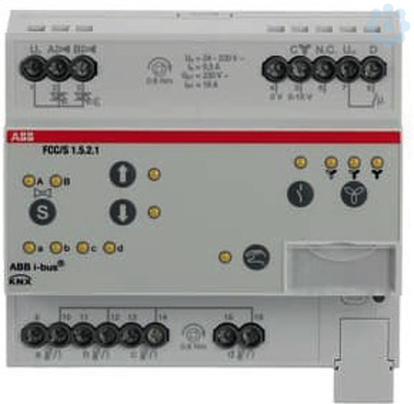 Zur Steuerung von Fan Coil Units bzw. Gebläsekonvektoren. Über zwei elektronische Ausgänge können zwei thermoelektrische Ventilantriebe oder ein motorbetriebener Ventilantrieb zum Heizen oder Kühlen gesteuert werden. Zur Lüftersteuerung besitzt das Gerät einen Analogausgang. Ein Relaisausgang schaltet eine zusätzliche Last von bis zu 16 A, wie z. B. eine elektrische Zusatzheizung. Über 4 Eingänge kann der Raumstatus erfasst und überwacht werden (nutzbar für Fensterkontakt, Taupunktsensor, Füllstandssensor oder Temperatursensor). Außerdem ist es möglich, ein analoges Raumbediengerät (SAR/A oder SAF/A) mit den Eingängen des Gerätes zu verbinden. Zur Regelung der Raumtemperatur verfügt das Gerät über einen integrierten Raumtemperaturregler, welcher direkt zur Steuerung der Ausgänge des Gerätes verwendet werden kann. Der FCC/S 1.5.2.1 verfügt über eine einfach zu nutzende Vorortbedienung. Für erweiterte Diagnosefunktionen sowie eine verbesserte Inbetriebnahme kann das ABB i-bus Tool genutzt werden.