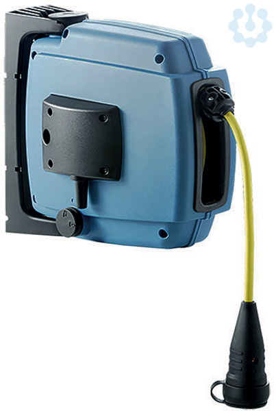 Federzug-Leitungsroller, Baureihe SYLT II, Eingang: 1 Knickschutztülle, mit innenliegender Zugentlastung, Ausgang: 17 m Leitung INDUSTRIEFLEX 07, 3 G 1,5 mm², mit Vollgummi-Schutzkontaktkupplung, Ausführung: - K2 Ausführung, - schutzisoliert und spritzwassergeschützt, - mit 3 Schleifringen, L1-N-PE, - maximale Strombelastbarkeit 10 A, - mit Überhitzungsschutz, - 160° schwenkbare Konsole, - Montage wahlweise an Wand, Boden oder Decke, - Lieferung mit Arretierung, von Hand abstellbar, - Antriebsfeder in Kassette gekapselt, - Gehäuse aus POM/PP, - Farbe: Blau