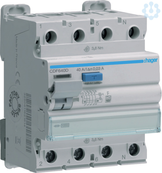 Fehlerstromschutzschalter 4 polig 10kA 40A 30mA Typ F. Fehlerstrom-Schutzschalter (FI) nach DIN EN 61008-2-1, VDE 0664 Teil 10 + 11, Berührungsschutz IP2x nach DIN VDE 0106 Teil 100. Geeignet zum nachträglichen Anbau von Zusatzeinrichtungen (Montage ohne Werkzeug). Anschlussklemmen mit Draht-Einschiebe-Schutz, Bi-Connect-Klemmen unten, externe blaue Test-Taste. Alle Produkte mit VDE Zeichen. Beschriftungsmöglichkeit direkt am Gerät.
