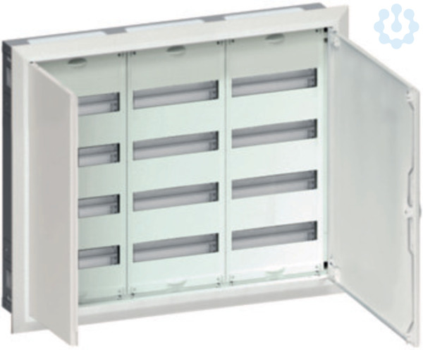 Feldverteiler UP 144PLE mit univers,IP30,SKII, Nischenmaße HxBxT:657x815x112mm. Feldverteiler UP/HW zertifiziert nach DIN EN 61 439-1/-3, Maßnorm nach DIN 43 870. Zum Einbau von Geräten bis 125 A, Luft- und Kriechstrecken nach DIN EN 60664-1, Schutzart IP30. Bestehend aus Schrank, Blendrahmen und Stahlblechtür, pulverbeschichtet in RAL 9010 (reinweiß). Komplettverteiler mit Einbausatz bestückt mit profilierten Tragschienen, 7,5mm hohen Hutschienen in 125 mm Mittenabstand und passenden Berührungsschutzabdeckungen (SKII) aus Kunststoff, ohne QuickConnect-Klemmblöcke. Leitungseinführungen oben/unten durch herausnehmbare Kunststoffflanschplatten mit Vorprägungen und integrierte Kabelzugentlastung. Seitlich und hinten ausschlagbare Leistungseinführungen. Tür mit innenliegenden justierbaren Scharnieren und einem Öffnungswinkel von 110°. Türen rechts und links anschlagbar, werkzeuglos wechselbarer Türanschlag. Türverschluss serienmäßig mit Vorreiber und Klappgriff plombierbar. Ab Schrankbreite 800 mm (3-feldig) zwei