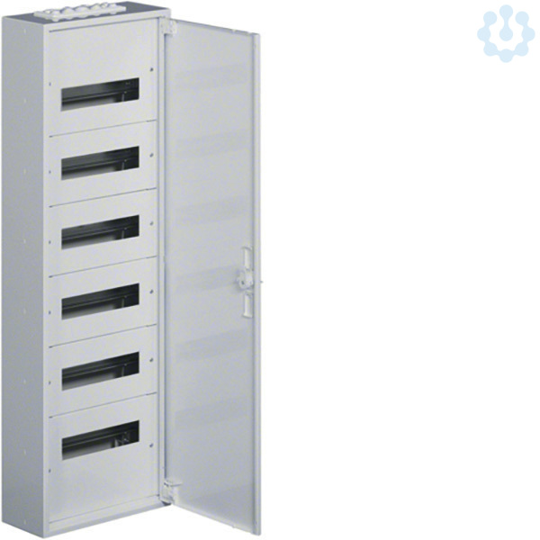 Feldverteiler,AP,FW2, IP30, Schutzklasse I,6x12 PLE, mit Tür, 6x12 PLE. Installationsverteiler AP nach OVE/ÖNORM EN 61 439-1/-3 und OVE/ÖNORN 62208. Zum Einbau für Reiheneinbaugeräte bis 125 A. Bestehend aus Schrank mit Tür aus reinweißen pulverbeschichtetem und eingebranntem Stahlblech. Der Einbausatz hat je 2 profilierte Tragschienen, stabile 15mm hohen Hutschienen in 150mm Mittenabstand und passenden reinweißen Berührungsschutzabdeckungen. Großzügiger Raum für die zu- und abgehenden Kabel durch je einen 200mm hohen Bereich. Vorprägungen für die Kabeleinführungen unten, oben sowie seitlich. Tür mit innenliegenden justierbaren Scharnieren und einem Öffnungswinkel von 130°. Tür rechts und links anschlagbar. Weißes formschönes Schlossschild mit Drehriegel - Klappverschluss. Austauschbare Schließsysteme, Kabelabfangschienen sowie verschiedene Klemmen siehe Zubehör.