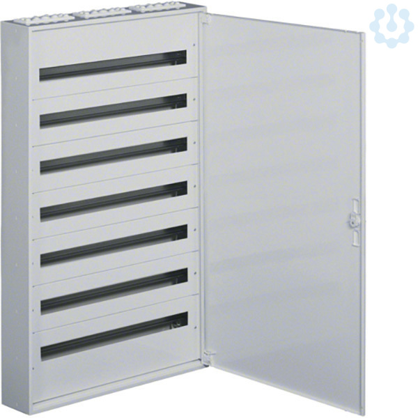 Feldverteiler,AP,FW2, IP30, Schutzklasse I,7x36 PLE, mit Tür, 7x36 PLE. Installationsverteiler AP nach OVE/ÖNORM EN 61 439-1/-3 und OVE/ÖNORN 62208. Zum Einbau für Reiheneinbaugeräte bis 125 A. Bestehend aus Schrank mit Tür aus reinweißen pulverbeschichtetem und eingebranntem Stahlblech. Der Einbausatz hat je 2 profilierte Tragschienen, stabile 15mm hohen Hutschienen in 150mm Mittenabstand und passenden reinweißen Berührungsschutzabdeckungen. Großzügiger Raum für die zu- und abgehenden Kabel durch je einen 200mm hohen Bereich. Vorprägungen für die Kabeleinführungen unten, oben sowie seitlich. Tür mit innenliegenden justierbaren Scharnieren und einem Öffnungswinkel von 130°. Tür rechts und links anschlagbar. Weißes formschönes Schlossschild mit Drehriegel - Klappverschluss. Austauschbare Schließsysteme, Kabelabfangschienen sowie verschiedene Klemmen siehe Zubehör.
