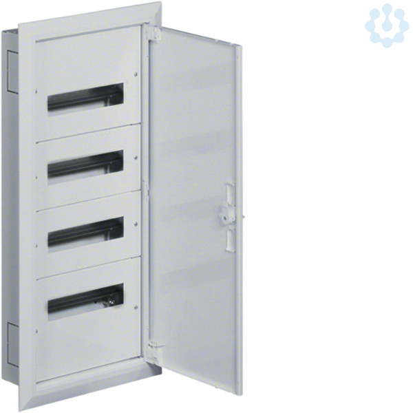 Feldverteiler,UP,FW2, IP30, SKI,mit Tür,4x12 PLE, Nischenmaße 770x334x110mm. Installationsverteiler UP/HW nach OVE/ÖNORM EN 61 439-1/-3 und OVE/ÖNORN 62208. Zum Einbau für Reiheneinbaugeräte bis 125 A. Bestehend aus Mauerwanne, Einbausatz und Tür mit Blendrahmen aus reinweißen pulverbeschichtetem und eingebranntem Stahlblech. Der Einbausatz hat je 2 profilierte Tragschienen, stabile 15mm hohen Hutschienen in 150mm Mittenabstand und passenden reinweißen Berührungsschutzabdeckungen. Großzügiger Raum für die zu- und abgehenden Kabel durch je einen 200mm hohen Bereich. Vorprägungen für die Kabeleinführungen unten, oben sowie seitlich. Tür mit innenliegenden justierbaren Scharnieren und einem Öffnungswinkel von 130°. Tür rechts und links anschlagbar. Weißes formschönes Schlossschild mit Drehriegel - Klappverschluss. Austauschbare Schließsysteme, Kabelabfangschienen sowie verschiedene Klemmen siehe Zubehör.