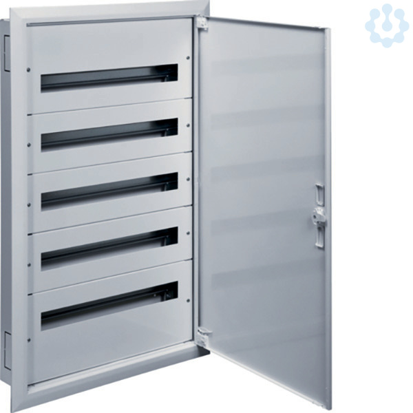 Feldverteiler,UP,FW2, IP30, SKI,mit Tür,5x24 PLE, Nischenmaße 920x550x110mm. Installationsverteiler UP/HW nach OVE/ÖNORM EN 61 439-1/-3 und OVE/ÖNORN 62208. Zum Einbau für Reiheneinbaugeräte bis 125 A. Bestehend aus Mauerwanne, Einbausatz und Tür mit Blendrahmen aus reinweißen pulverbeschichtetem und eingebranntem Stahlblech. Der Einbausatz hat je 2 profilierte Tragschienen, stabile 15mm hohen Hutschienen in 150mm Mittenabstand und passenden reinweißen Berührungsschutzabdeckungen. Großzügiger Raum für die zu- und abgehenden Kabel durch je einen 200mm hohen Bereich. Vorprägungen für die Kabeleinführungen unten, oben sowie seitlich. Tür mit innenliegenden justierbaren Scharnieren und einem Öffnungswinkel von 130°. Tür rechts und links anschlagbar. Weißes formschönes Schlossschild mit Drehriegel - Klappverschluss. Austauschbare Schließsysteme, Kabelabfangschienen sowie verschiedene Klemmen siehe Zubehör.