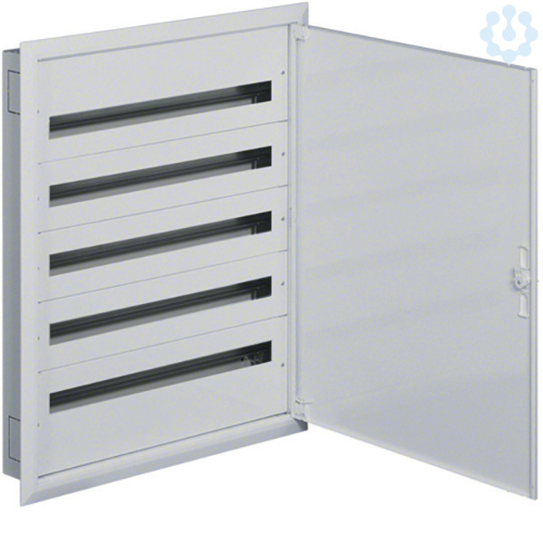 Feldverteiler,UP,FW2, IP30, SKI,mit Tür,5x36 PLE, Nischenmaße 920x766x110mm. Installationsverteiler UP/HW nach OVE/ÖNORM EN 61 439-1/-3 und OVE/ÖNORN 62208. Zum Einbau für Reiheneinbaugeräte bis 125 A. Bestehend aus Mauerwanne, Einbausatz und Tür mit Blendrahmen aus reinweißen pulverbeschichtetem und eingebranntem Stahlblech. Der Einbausatz hat je 2 profilierte Tragschienen, stabile 15mm hohen Hutschienen in 150mm Mittenabstand und passenden reinweißen Berührungsschutzabdeckungen. Großzügiger Raum für die zu- und abgehenden Kabel durch je einen 200mm hohen Bereich. Vorprägungen für die Kabeleinführungen unten, oben sowie seitlich. Tür mit innenliegenden justierbaren Scharnieren und einem Öffnungswinkel von 130°. Tür rechts und links anschlagbar. Weißes formschönes Schlossschild mit Drehriegel - Klappverschluss. Austauschbare Schließsysteme, Kabelabfangschienen sowie verschiedene Klemmen siehe Zubehör.