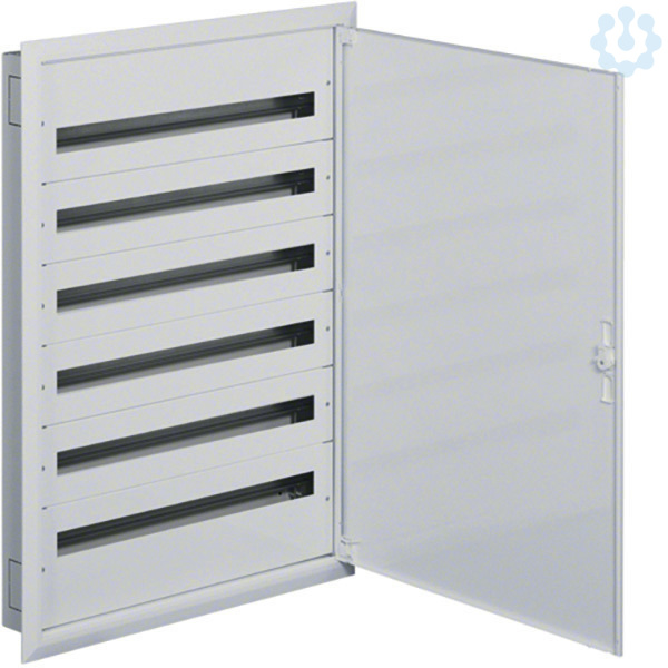 Feldverteiler,UP,FW2, IP30, SKI,mit Tür,6x36 PLE, Nischenmaße 1070x766x110mm. Installationsverteiler UP/HW nach OVE/ÖNORM EN 61 439-1/-3 und OVE/ÖNORN 62208. Zum Einbau für Reiheneinbaugeräte bis 125 A. Bestehend aus Mauerwanne, Einbausatz und Tür mit Blendrahmen aus reinweißen pulverbeschichtetem und eingebranntem Stahlblech. Der Einbausatz hat je 2 profilierte Tragschienen, stabile 15mm hohen Hutschienen in 150mm Mittenabstand und passenden reinweißen Berührungsschutzabdeckungen. Großzügiger Raum für die zu- und abgehenden Kabel durch je einen 200mm hohen Bereich. Vorprägungen für die Kabeleinführungen unten, oben sowie seitlich. Tür mit innenliegenden justierbaren Scharnieren und einem Öffnungswinkel von 130°. Tür rechts und links anschlagbar. Weißes formschönes Schlossschild mit Drehriegel - Klappverschluss. Austauschbare Schließsysteme, Kabelabfangschienen sowie verschiedene Klemmen siehe Zubehör.