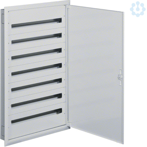 Feldverteiler,UP,FW2, IP30, SKI,mit Tür,7x36 PLE, Nischenmaße 1220x766x110mm. Installationsverteiler UP/HW nach OVE/ÖNORM EN 61 439-1/-3 und OVE/ÖNORN 62208. Zum Einbau für Reiheneinbaugeräte bis 125 A. Bestehend aus Mauerwanne, Einbausatz und Tür mit Blendrahmen aus reinweißen pulverbeschichtetem und eingebranntem Stahlblech. Der Einbausatz hat je 2 profilierte Tragschienen, stabile 15mm hohen Hutschienen in 150mm Mittenabstand und passenden reinweißen Berührungsschutzabdeckungen. Großzügiger Raum für die zu- und abgehenden Kabel durch je einen 200mm hohen Bereich. Vorprägungen für die Kabeleinführungen unten, oben sowie seitlich. Tür mit innenliegenden justierbaren Scharnieren und einem Öffnungswinkel von 130°. Tür rechts und links anschlagbar. Weißes formschönes Schlossschild mit Drehriegel - Klappverschluss. Austauschbare Schließsysteme, Kabelabfangschienen sowie verschiedene Klemmen siehe Zubehör.