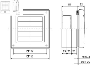 Für den Einbau in Fenster und dünne Wände. Farbe verkehrsweiß ähnlich RAL 9016. Gehäuse aus schlagfestem Kunststoff. Lieferumfang: Außenklappe AP bzw. Außengitter SG, 3 x Distanzrahmen, 2 x Dichtungsringe, Gewindestutzen, 3 x Schrauben zur Ventilatorbefestigung, Zugentlastungsbügel mit 2 x Schrauben, Leitungstülle, Montageanleitung. Montagehinweise: Einfache Montage im Fensterausschnitt durch ineinander verschraubbaren Adapter und Gewindstutzen. Scheibendicke mindestens 3 mm, Scheibenabstand bis 75 mm. Scheibenausschnitt 115 bis 120 mm. Nicht für den Einbau in aufklappbare Doppelfenster geeignet. Elektrischer Anschluss: An der Klemmleiste im Gehäuse des ECA 100 ipro...Artikel: FE 100/1 AP, Einbauort: Fenster / dünne Wand, Einbaulage: waagerecht, Material: Kunststoff, schlagfest, Farbe: verkehrsweiß, ähnlich RAL 9016, Gewicht: 0,4 kg, Breite: 150 mm, Höhe: 150 mm, Tiefe: 103 mm