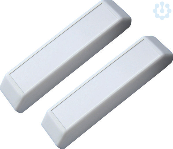 Fensterkontakt mit Reedrelais, 1 Öffner. Schaltleistung 5W bzw. VA. Schaltspannung max. 175V UC. Der Fensterkontakt besteht aus einem Reedrelais mit Anschlussklemmen und einem Magneten. Der normalerweise geschlossene Kontakt öffnet, sobald der Magnet näher als 25mm gekommen ist. An die Klemmen T1 und T2 des Trennrelais ETR61NP angeschlossen, wird die Stromversorgung eines Dunstabzuges zugeschaltet, solange das Fenster offen ist. Das ETR61NP kann in die UP-Dose hinter die Steckdose für den Dunstabzug gelegt werden. Montage des Fensterkontaktes FK: Auf der Gehäuse-Schmalseite die Einsätze heraushebeln. Reedrelais anschließen und Gehäuse-Ausschnitt für die Leitung ausschneiden. Beide Gehäuse maximal 15mm entfernt parallel ankleben und gegebenenfalls zusätzlich anschrauben. In der Längsrichtung kann der Magnet gegenüber dem Reedrelais beliebig verdreht sein.