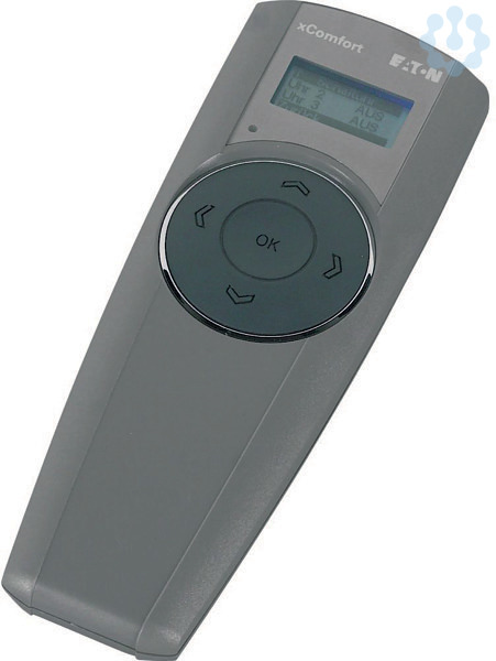Die Fernbedienung 12-fach mit Display ermöglicht das komfortable und einfache Bedienen und Steuern der verschiedensten Funktionen wie z.B.: Beleuchtung, Beschattung, usw. Insgesamt können 12 Funktionen am blau hintergrundbeleuchteten Display ausgewählt und bedient werden. Die Namen der Funktionen sind entweder frei einstellbar oder aus ca. 20 bereits vordefinierten Namen auswählbar. Eine integrierte Uhr zeigt Datum und Uhrzeit an, 3 Schaltuhren können vom Benutzer individuell eingestellt und auf jeweils eine der 12 Funktionen zugewiesen werden. Ein Passwortschutz verhindert unerlaubten Zugriff auf die Einstellmöglichkeiten. Zum Systemupdate oder zur Funktionserweiterungen wird die im Batteriefach integrierte IR-Schnittstelle verwendet. Die gelbe LED zeigt an, ob das Signal abgesendet, richtig verstanden und auch rückbestätigt wurde. Die Batterieanzeige informiert rechtzeitig vor einem notwendigen Batteriewechsel. Das mobile Gerät ist mit zwei AAA-Batterien versorgt. Eine optionale Wandhalterung mittels Magn