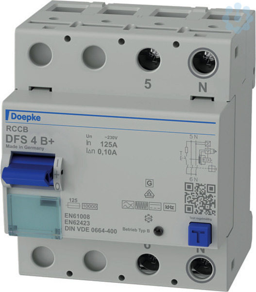 Fehlerstromschutzschalter (RCCB) schalten die Stromversorgung ab, wenn gefährlich hohe Fehlerströme auftreten. Sie schützen so Personen, Tiere und Anlagen. DFS 4 sind zwei- oder vierpolige Fehlerstromschutzschalter für ein- oder dreiphasige Netze. In Standardausführung sind die kompakten Geräte vier Teilungseinheiten schmal. Sie sind mit vielen verschiedenen Fehlerstromtypen und Ausführungen bei Bemessungsströmen bis zu 125 A erhältlich. Die großen Doppelstockklemmen können auch große Leiterquerschnitte aufnehmen. Die Ausgelöststellung des Multifunktionsschaltknebel erleichtert die Fehlersuche. Die kostenlose Etikettensoftware hilft bei der Beschriftung. Fehlerstromschutzschalter des Typs B+ sind allstromsensitiv. Sie schützen vor Puls- und Wechselfehlerströmen, Fehlerströmen mit Mischfrequenzen und glatten Gleichfehlerströmen. Sie erkennen lückenlos Fehlerströme aller Frequenzen bis 20 kHz bei einer maximalen Auslöseschwelle von 420 mA. Die Schalter bieten damit einen gehobenen Brandschutz. Geräte in Standar