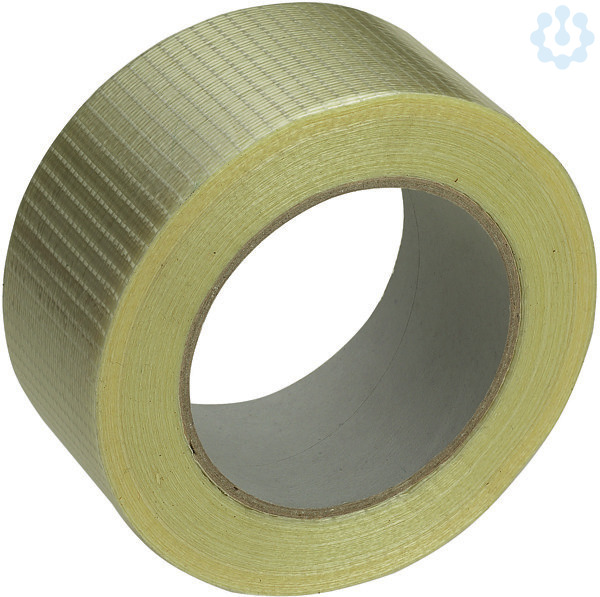 Filament-Klebeband mit Gitter-Fadenverstärkung, Trägerschicht aus Polypropylen, verstärkt mit durchgehenden, längs und quer verlaufenden, vernetzten Nylonfäden, einseitig beschichtet mit Kautschukkleber, ausgezeichnete Beständigkeit gegen Abrieb, äußerst reißfest (Längs- und Querfestigkeit), kein seitliches Ausfasern, starke Soforthaftung, Bündelung und Durchziehen von Kabeln und Kabelsträngen, hochfestes Paketband zum Verschließen und Verstärken auch von schweren Verpackungen, z. B. von Pappschachteln und Kartons, Umreifen schwerer Packstücke und anderer Güter, Banderolieren von Kunststoff- und Metallrohren, Metallstäben, usw.