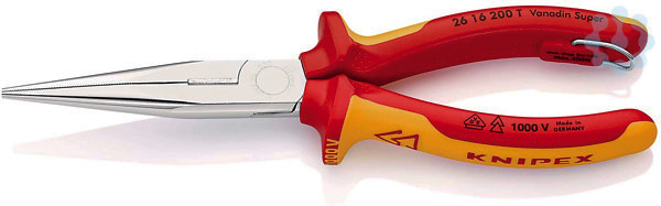 26 16 200 T Flachrundzange mit Schneide Elastische Spitzen: formstabil auch bei Verwindung. Verwindungstolerante, elastische Präzisionsspitzen. Flach-runde, lange, spitz zulaufende Backen. Mit Schneiden für weichen, mittelharten und harten Draht. Schneiden zusätzlich induktiv gehärtet, Schneidenhärte ca. 61 HRC. Zange mit integrierter isolierter Befestigungsöse zum Anbringen einer Absturzsicherung. - Schneidwerte mittelharter Draht (Durchmesser): Ø 3,2mm - Schneidwerte harter Draht (Durchmesser): Ø 2,2mm - Backendicke (am Gelenk) (T1): 9,5mm - Spitzenbreite (W4): 3,0mm - Spitzendicke (T2): 2,5mm - Backenlänge (L3): 73,0mm - Kopfbreite (W3): 18mm - Absturzsicherung: Ja   - VDE-geprüft: Ja
