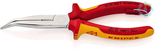 26 26 200 T Flachrundzange mit Schneide Elastische Spitzen: formstabil auch bei Verwindung. Verwindungstolerante, elastische Präzisionsspitzen. Flach-runde, lange, spitz zulaufende Backen. Mit Schneiden für weichen, mittelharten und harten Draht. Schneiden zusätzlich induktiv gehärtet, Schneidenhärte ca. 61 HRC. Zange mit integrierter isolierter Befestigungsöse zum Anbringen einer Absturzsicherung. - Schneidwerte mittelharter Draht (Durchmesser): Ø 3,2mm - Schneidwerte harter Draht (Durchmesser): Ø 2,2mm - Backendicke (am Gelenk) (T1): 9,5mm - Spitzenbreite (W4): 3,0mm - Spitzendicke (T2): 2,5mm - Greifflächenlänge (L4): 23,0mm - Backenlänge (L3): 73,0mm - Kopfbreite (W3): 18mm - Absturzsicherung: Ja   - VDE-geprüft: Ja