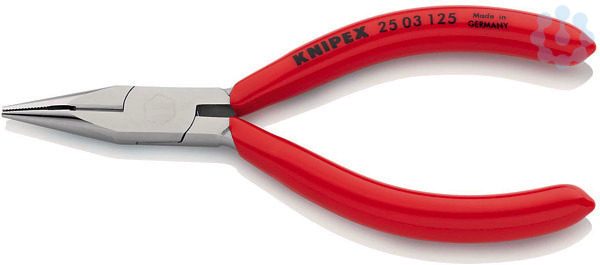 25 03 125 Flachrundzange mit Schneide Geeignet für feinere Greif- und Schneidarbeiten. Flach-runde, lange, spitz zulaufende Backen. Greifflächen gezahnt. Mit Schneiden für weichen, mittelharten und harten Draht. Schneiden zusätzlich induktiv gehärtet, Schneidenhärte ca. 61 HRC. gerade Backen. - Schneidwerte mittelharter Draht (Durchmesser): Ø 2,2mm - Schneidwerte harter Draht (Durchmesser): Ø 1,6mm - Backendicke (am Gelenk) (T1): 7,0mm - Spitzenbreite (W4): 2,5mm - Spitzendicke (T2): 1,8mm - Backenlänge (L3): 27,0mm - Kopfbreite (W3): 13mm