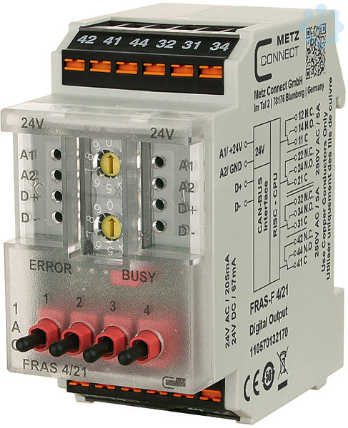 CAN-Modul mit 4 digitalen Ausgängen. Geeignet zum Schalten elektrischer Komponenten, z. B. Motoren, Schütze, Lampen, Jalousien usw. Bei starken induktiven Lasten empfehlen wir die Relaiskontakte zusätzlich mit einem RC-Glied zu schützen. Das Feldbusmodul ist ein universell einsetzbares Eingangsmodul, welches über den CAN-BUS angesteuert wird. Dabei wird das Modul über eine einstellbare Adresse angesprochen und in den Datenbytes wird übermittelt, ob Daten angefordert oder ob Befehle auszuführen sind. Ist ein digitales Eingabemodul mit gleicher Adresse im System vorhanden, kann das Modul ferngesteuert werden.Anschluss mit Federkraftklemmen (Push-In)