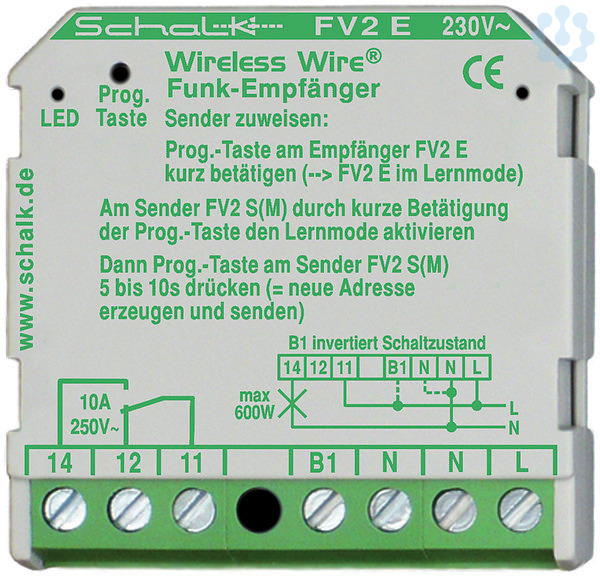 Das Funk-Verbinder-System FV2 ist für die drahtlose Übertragung von Schaltzuständen in Verbindung mit batteriebetriebenen Sendern optimiert., Funkverbinder-Empfänger FV2 E für das FV2 System mit potenzialfreiem 10A Wechslerkontakt. Einfache Anwendung als Leitungs-Ersatz (Eingangszustand am Sender wird auf den Relaiskontakt am Empfänger übertragen). Punkt- zu Mehrpunkt-Verbindung möglich (ein Sendereingang steuert mehrere Empfänger). Mehrere Funk-Verbindungen nebeneinander installierbar (individuelle Adressierung). Sender mit 230 V AC oder mit Batterieversorgung verfügbar (12-24 V UC auf Anfrage). Freifeld-Reichweite 50m (keine externe Antenne). In Verbindung mit dem batteriebetriebenen Funkverbinder-System FV2 SM lässt sich somit z.B. eine für geschlossene Räume häufig vorgeschriebene Zuluftüberwachung beim Betrieb von Abzugventilatoren ohne die Verlegung von Leitungen realisieren. , Maße: 43x43x18,5mm, 230V AC - 1 Wechsler 10A