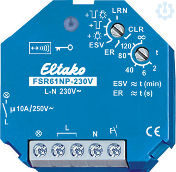Funkaktor Stromstoß-Schaltrelais 230V. 1 Schließer nicht potenzialfrei 10A/250V AC, Glühlampen 2000 Watt, Rückfallverzögerung mit Ausschaltvorwarnung und Taster-Dauerlicht zuschaltbar. Verschlüsselter Funk, bidirektionaler Funk und Repeater-Funktion zuschaltbar. Stand-by-Verlust nur 0,8 Watt. Für Einbaumontage. 45mm lang, 45mm breit, 33mm tief. Beim Ausfall der Versorgungsspannung bleibt der Schaltzustand erhalten. Bei wiederkehrender Versorgungsspannung wird definiert ausgeschaltet. Nach der Installation die automatische kurze Synchronisation abwarten, bevor der geschaltete Verbraucher an das Netz gelegt wird. Zusätzlich zum Funk-Steuereingang über eine innenliegende Antenne kann dieser Funkaktor auch mit einem eventuell davor montierten konventionellen 230V-Steuertaster örtlich gesteuert werden. Ein Glimmlampenstrom ist nicht zugelassen. Es können verschlüsselte Sensoren eingelernt werden. Es kann bidirektionaler Funk und/oder eine Repeater-Funktion eingeschaltet werden. Jede Zustandsänderung sowie eingegan