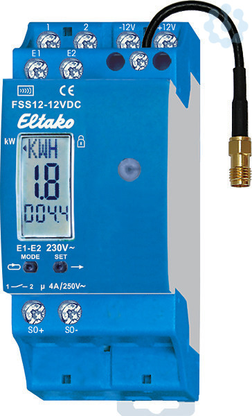 Funk-Stromzähler-Sendemodul zum Anschluss an die S0-Schnittstelle vieler Wechselstromzähler und Drehstromzähler. Stand-by-Verlust nur 0,5Watt. Mit Lastabwurfrelais 1 Schließer potenzialfrei 4A/250V und mit austauschbarer Sendeantenne. Bei Bedarf kann eine Funkantenne FA250 angeschlossen werden. Reiheneinbaugerät für Montage auf Tragschiene, 2 Teilungseinheiten = 36mm breit, 58mm tief. Das Stromzähler-Sendemodul FSS12 wertet die Signale der S0-Schnittstelle eines Stromzählers aus und sendet Funktelegramme mit dem Verbrauch und dem Zählerstand in den Eltako-Gebäudefunk zur Auswertung am Rechner mit der Visualisierungs- und Steuerungs-Software GFVS 4.0 und GFVS-Energy. Bei Drehstromzählern zusätzlich die Information über Hochtarif HT bzw. Niedertarif NT, sofern die E1/E2-Klemmen eines Drehstromzählers mit E1/E2 des FSS12 verbunden sind. Ab der Fertigungswoche 42/2012 zusätzlich mit frei wählbarer Impulsrate. GFVS-Energy unterstützt bis zu 100 Sendemodule, GFVS 3.0 bis zu 250 Sendemodule. Die 12V DC-Stromversorgu